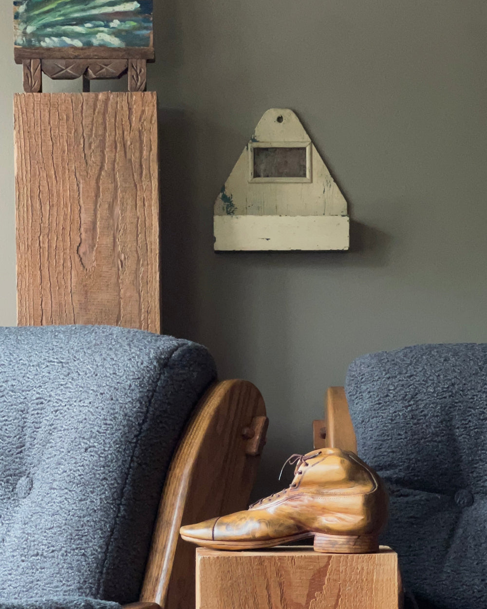 Crafted wood shaving wall mirror roughly painted in pale yellow and green. A lovely and functional object for an entry or bath.