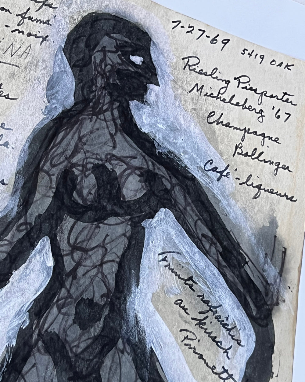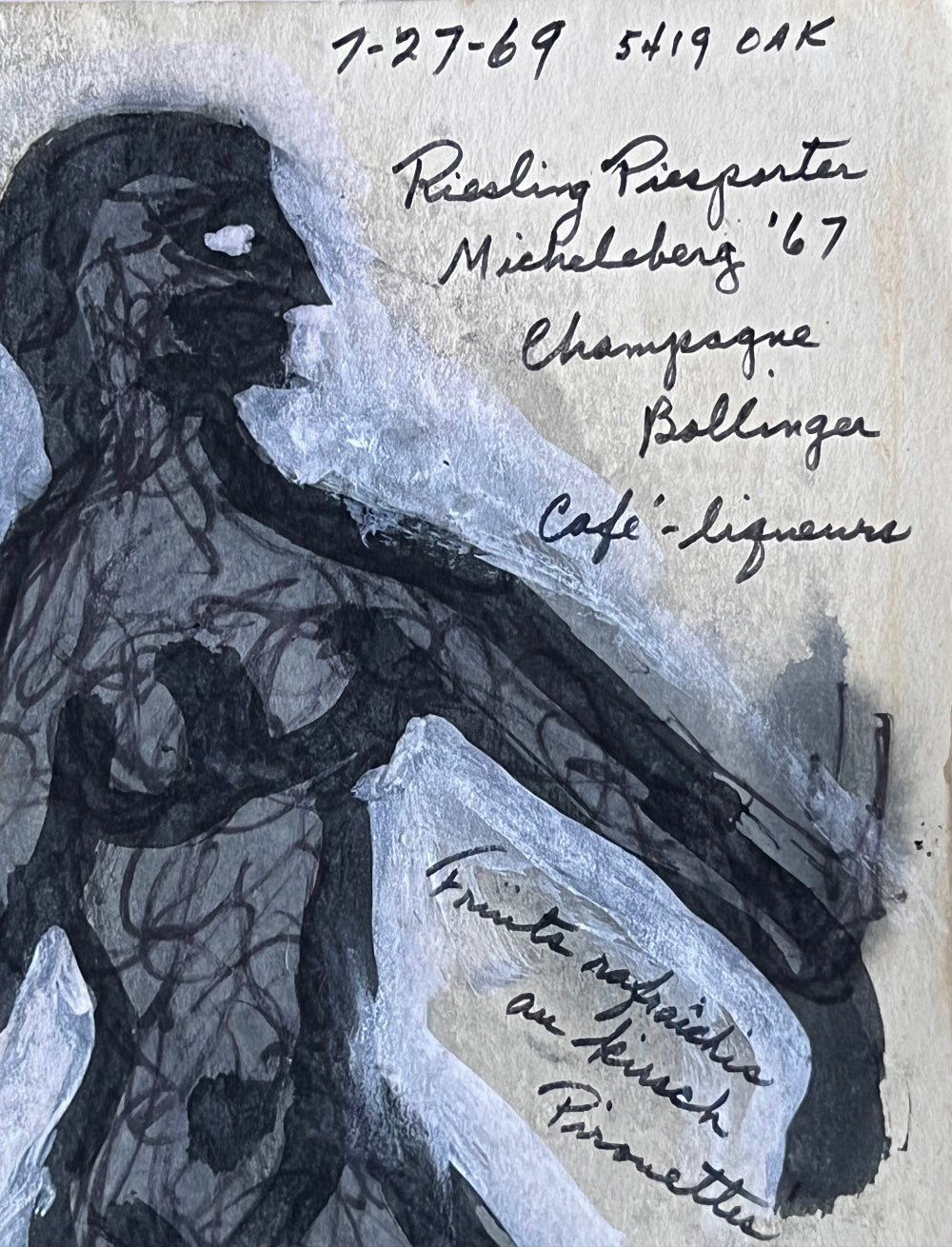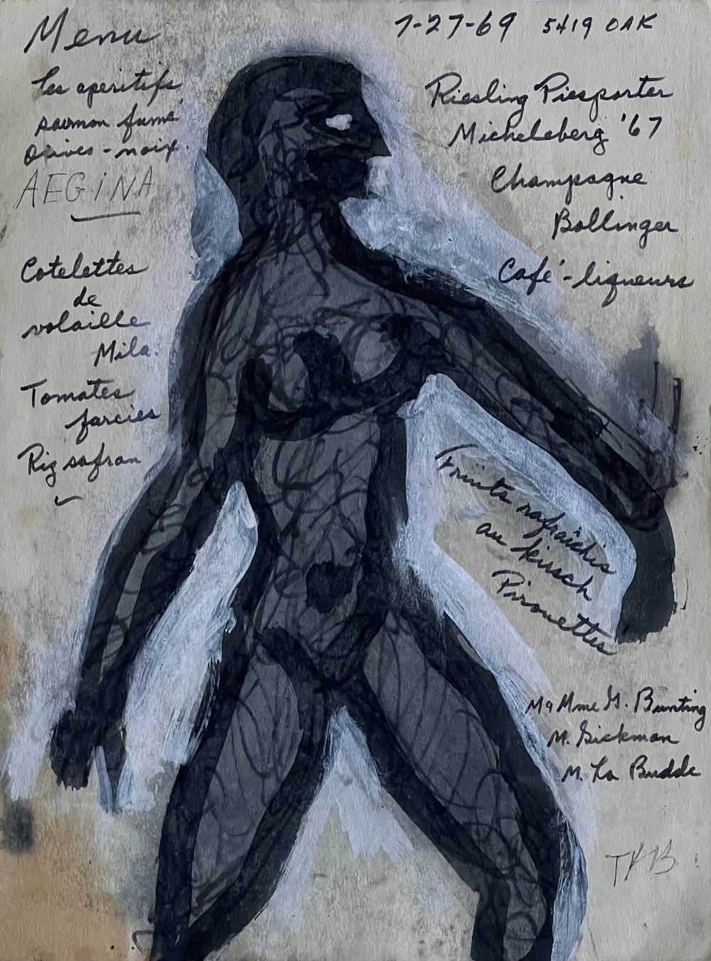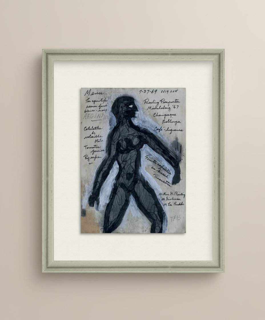 Ready for pickup week of October 20th. Incredible work of art rich in Kansas City history. Hand written & illustrated menu was an invitation to a Thanksgiving dinner hosted by a group of Kansas City Art Institute students back in 1969. Names and actual address (Brookside) still present on the paper. Custom framed in a french blue wood frame and floating over an off white backer.
