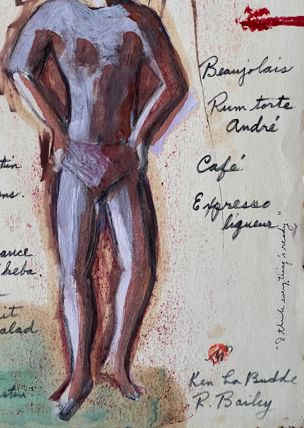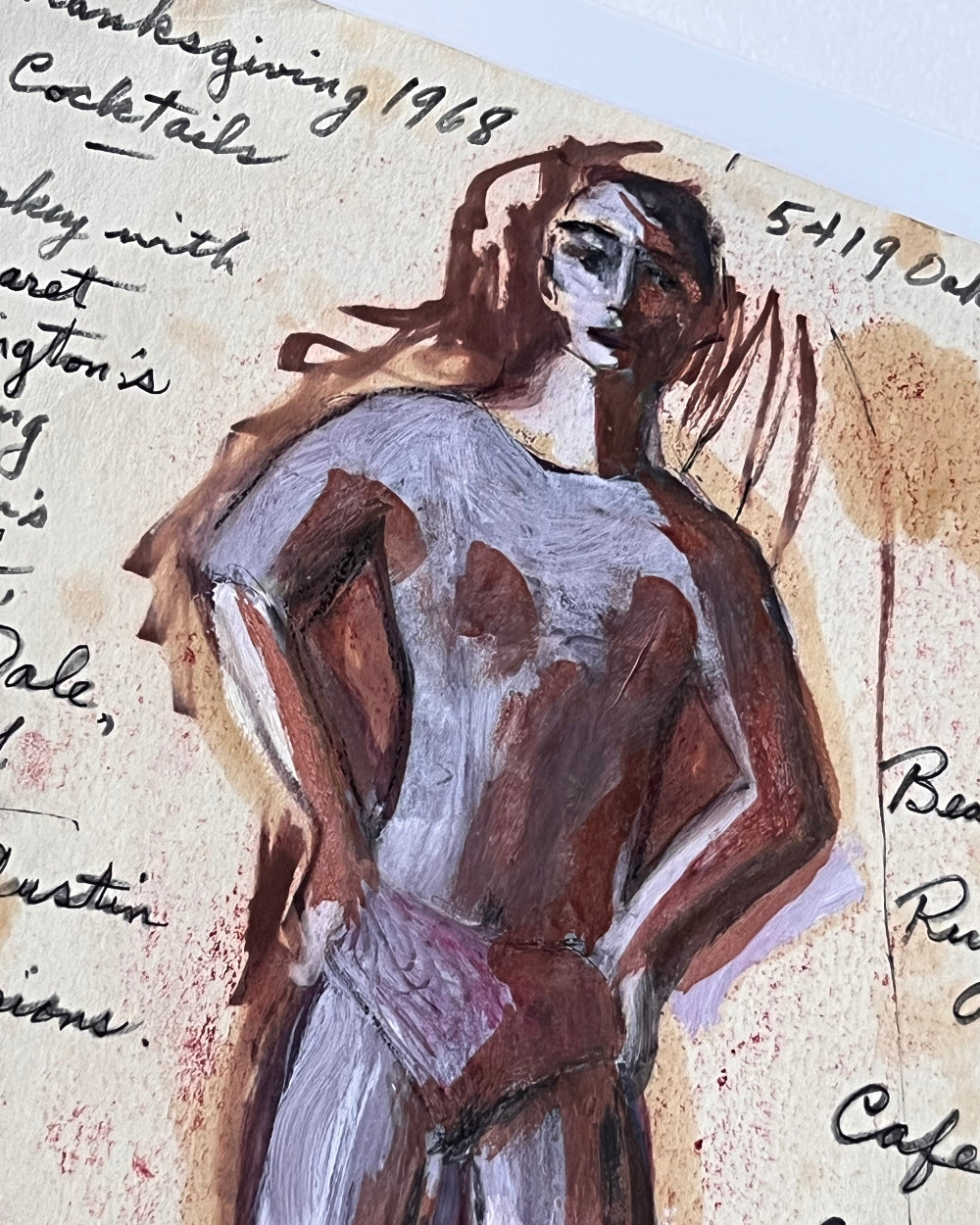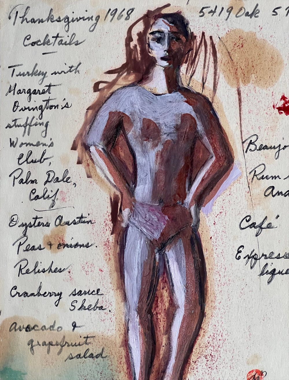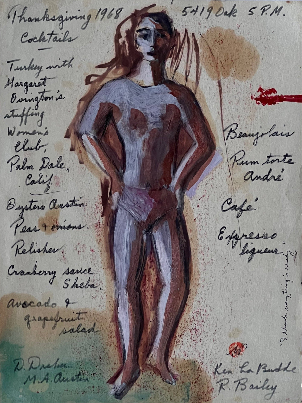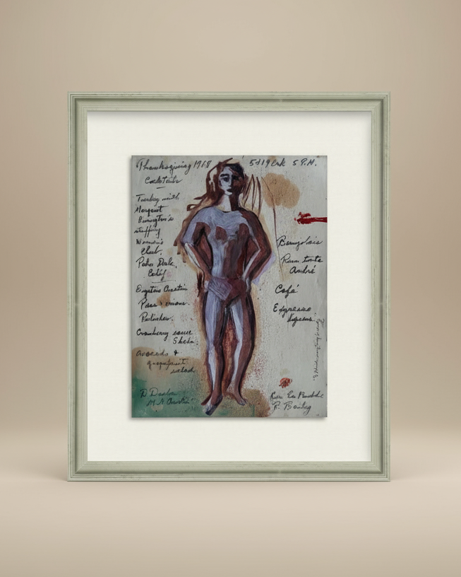 Ready for pickup week of October 20th. Incredible work of art rich in Kansas City history. Hand written & illustrated menu was an invitation to a Thanksgiving dinner hosted by a group of Kansas City Art Institute students back in 1968. Names and actual address (Brookside) still present on the paper. Custom framed in a french blue wood frame and floating over an off white backer.