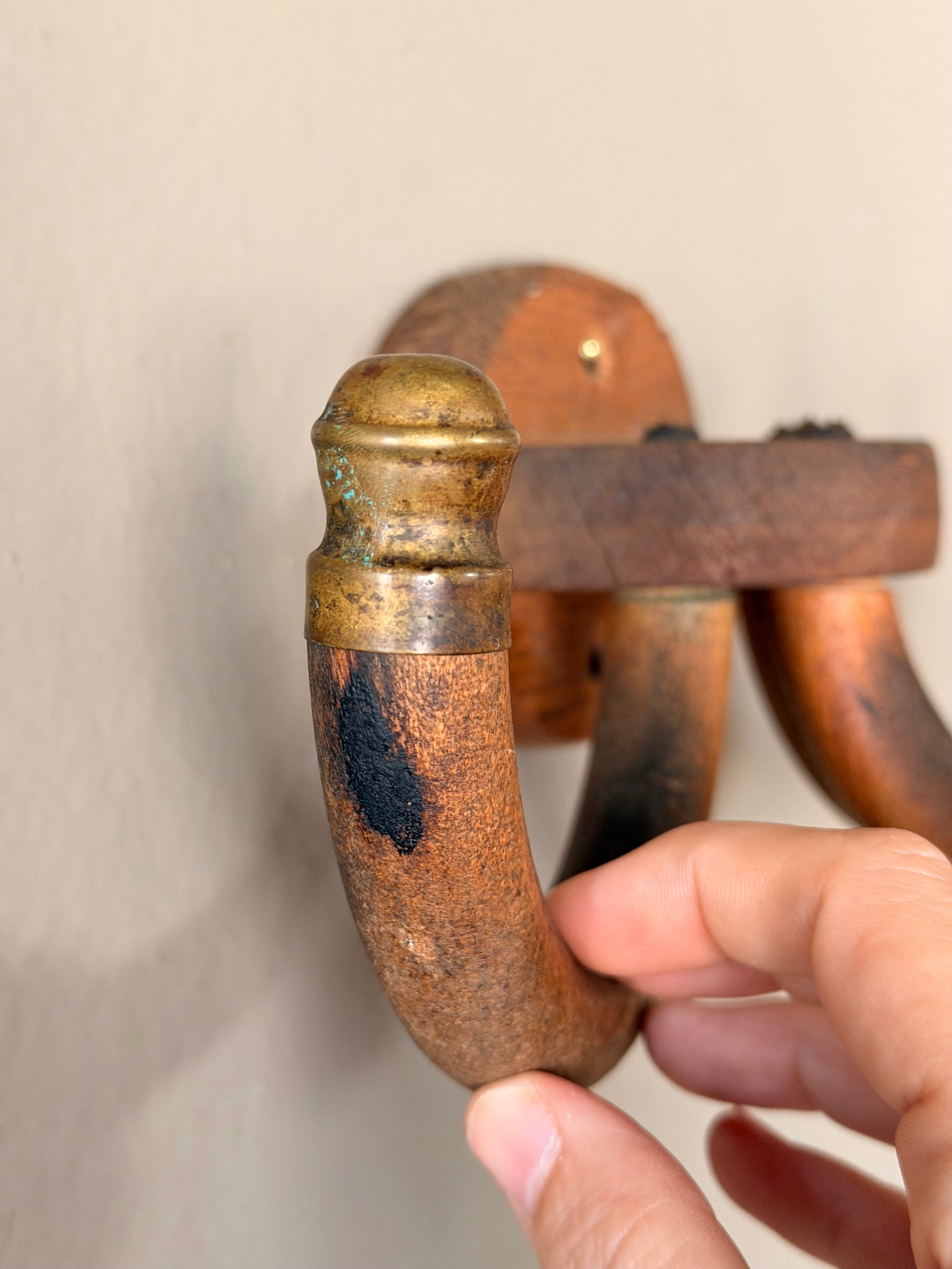 Vintage handmade articulating three arm wall hook with beautiful brass tipped detail. Solid construction. c.1930's.