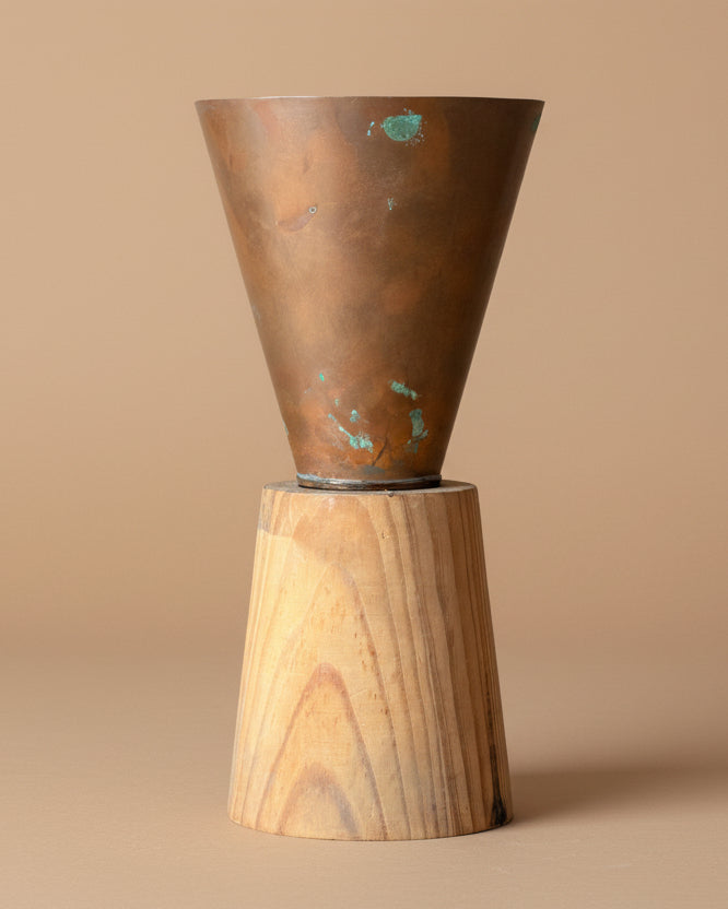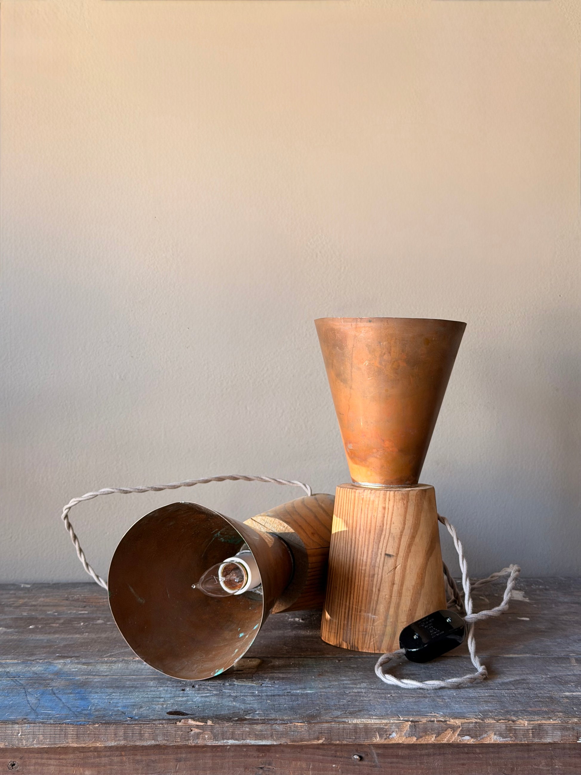 Artist made uplights crafted from found elements. These simple but beautiful table lamps have been constructed from aged copper for the shades and scrap wood for the bases. Wired with on/off switch on fabric cord. Sold as a pair.