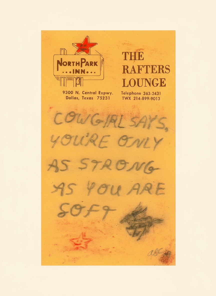 Cowgirl says your strength is in your softness. Printed on Entrada Rag fine art paper. Pocket Note prints are small, affordable prints, perfect for your altar, desk, camper van, or already-crowded gallery wall. Entrada is a 100% cotton, smooth fine art paper. It is an archival acid and lignin-free paper engineered for accurate color reproduction and longevity.