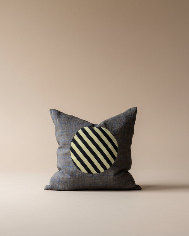 Designed and crafted by local artist Zoey Chamberlain from fabric remnants repurposed from a local clothing studio. Lovely charcoal and navy blue windowpane body with a green and black silk circle in the center. Zipper closure. Feather insert included. 1 available.