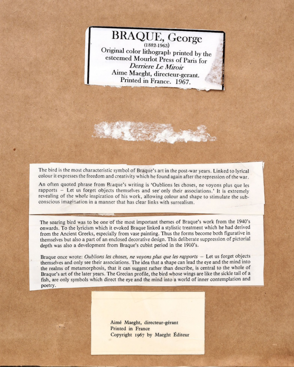 Komposition, for Derriere le Miroir (Composition for Behind the Mirror) by Georges Braque (after), a French Impressionist & Modern artist (1882-1963). Color lithograph on paper. Printed by Mourlot (Paris) and published by Maeght Editeur (Paris) in 1967.