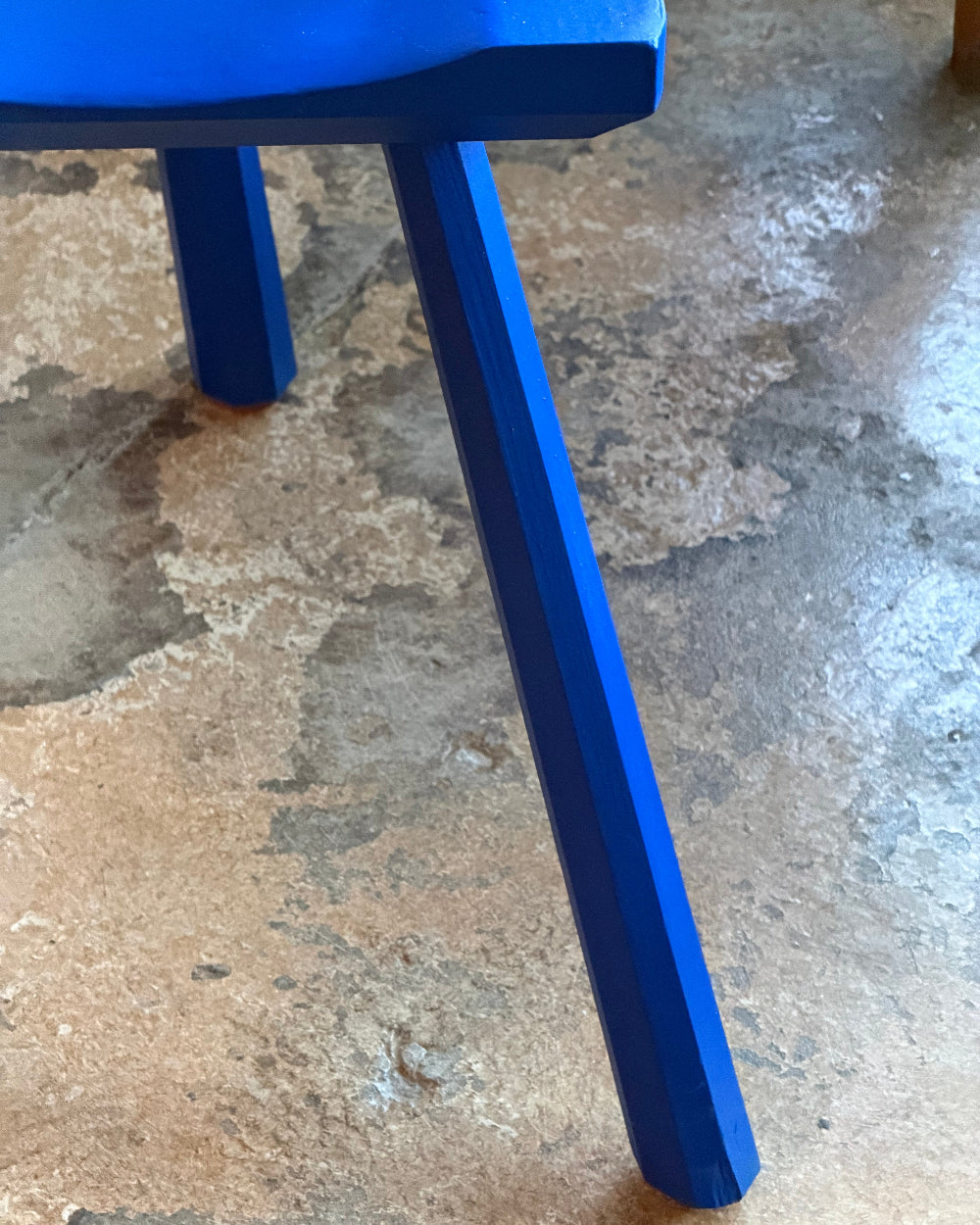 One-of-a-kind cwtch chair (Welsh term for hug) completely handmade, with mortise and tenon joinery in cherry and oak wood. The design is set up for dining or working at a desk. It gives plenty of lumbar support for a long day at the computer. Finished in a striking Klein Blue acrylic. Only one available.