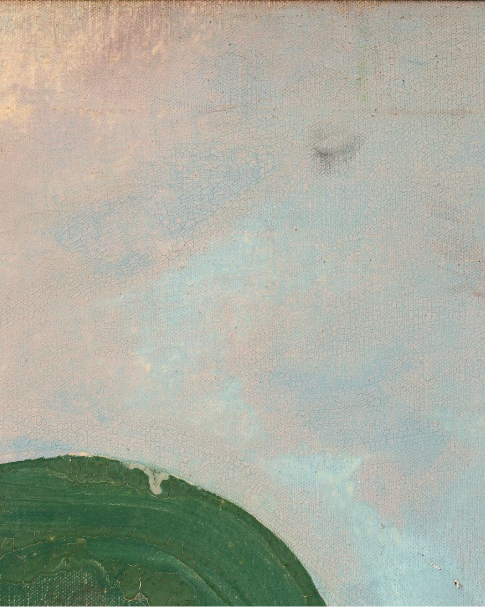 Untitled original oil on canvas by Michael Stack (1941-2018). Signed and dated (1967) to the bottom right corner. Gorgeous color palette on a dramatically large stretched canvas. Two figures seem to intertwined in the center with a rich background of black and blue-grey. Some accumulated grime. A subtle network of crackle in the upper left (see pictures).