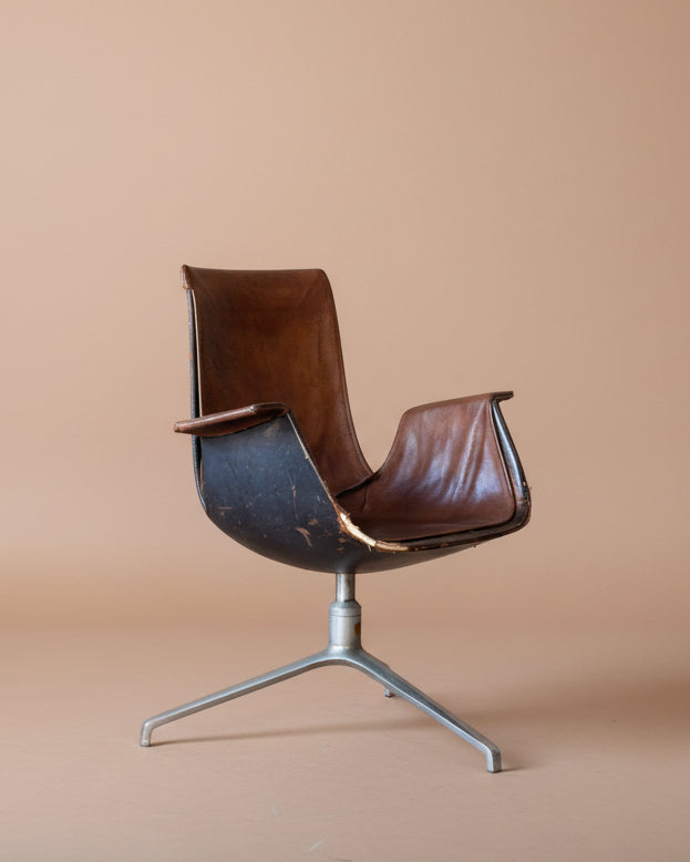Leather Bird Chair designed by Danish duo Preben Fabricius and Jørgen Kastholm for Walter Knoll. c. 1970's. Features three legged aluminum base (does not swivel) buffalo leather upholstery with original leather topper. This piece has been loved and worn over the decades. A stunning design with lots of years left to be appreciated.