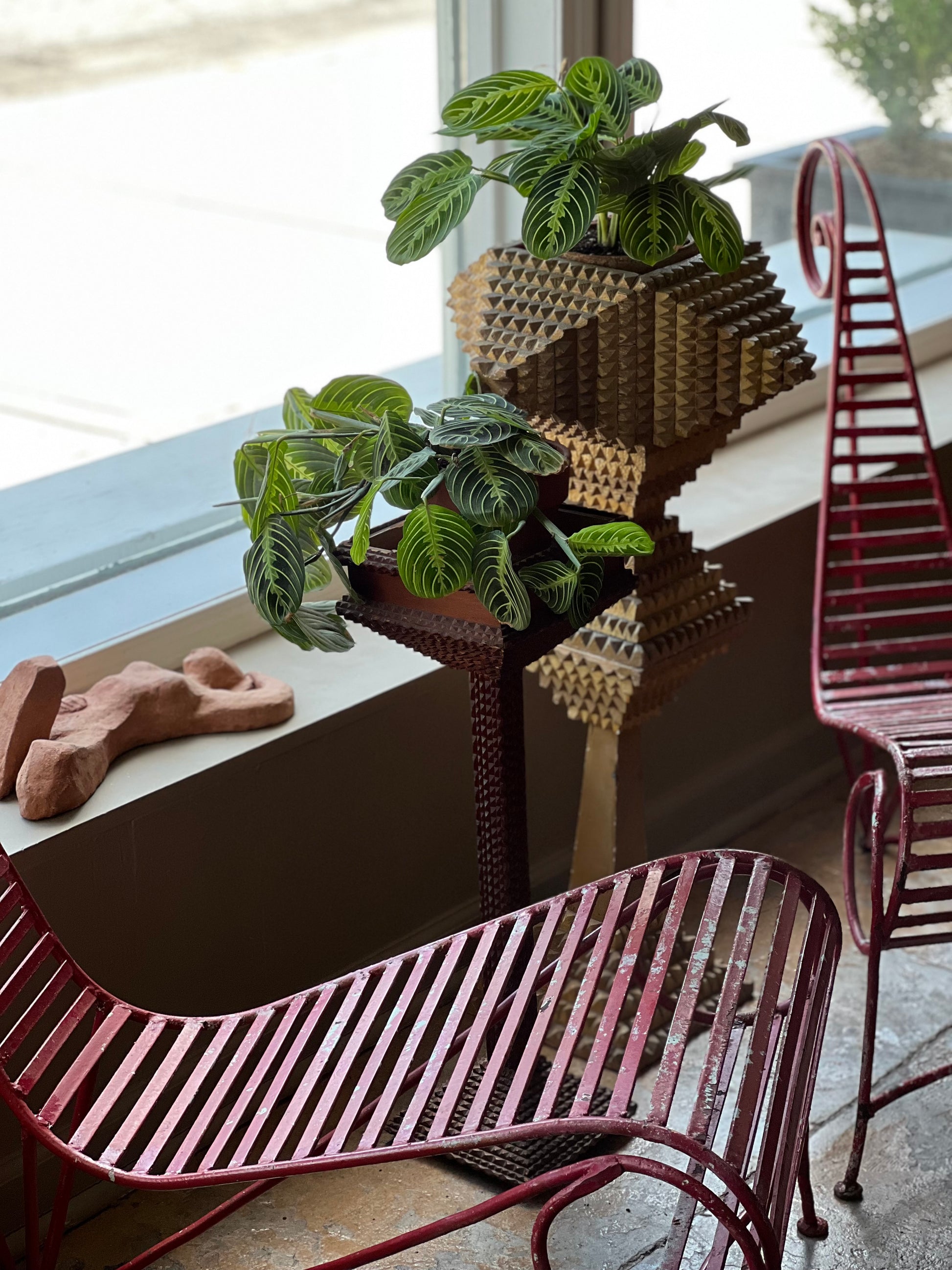 Sold as a pair. In the style of André Dubreuil. c. 1980's. Red powder coated iron frames. Time worn from the outdoors, but in excellent condition. Contact for more information if needed.