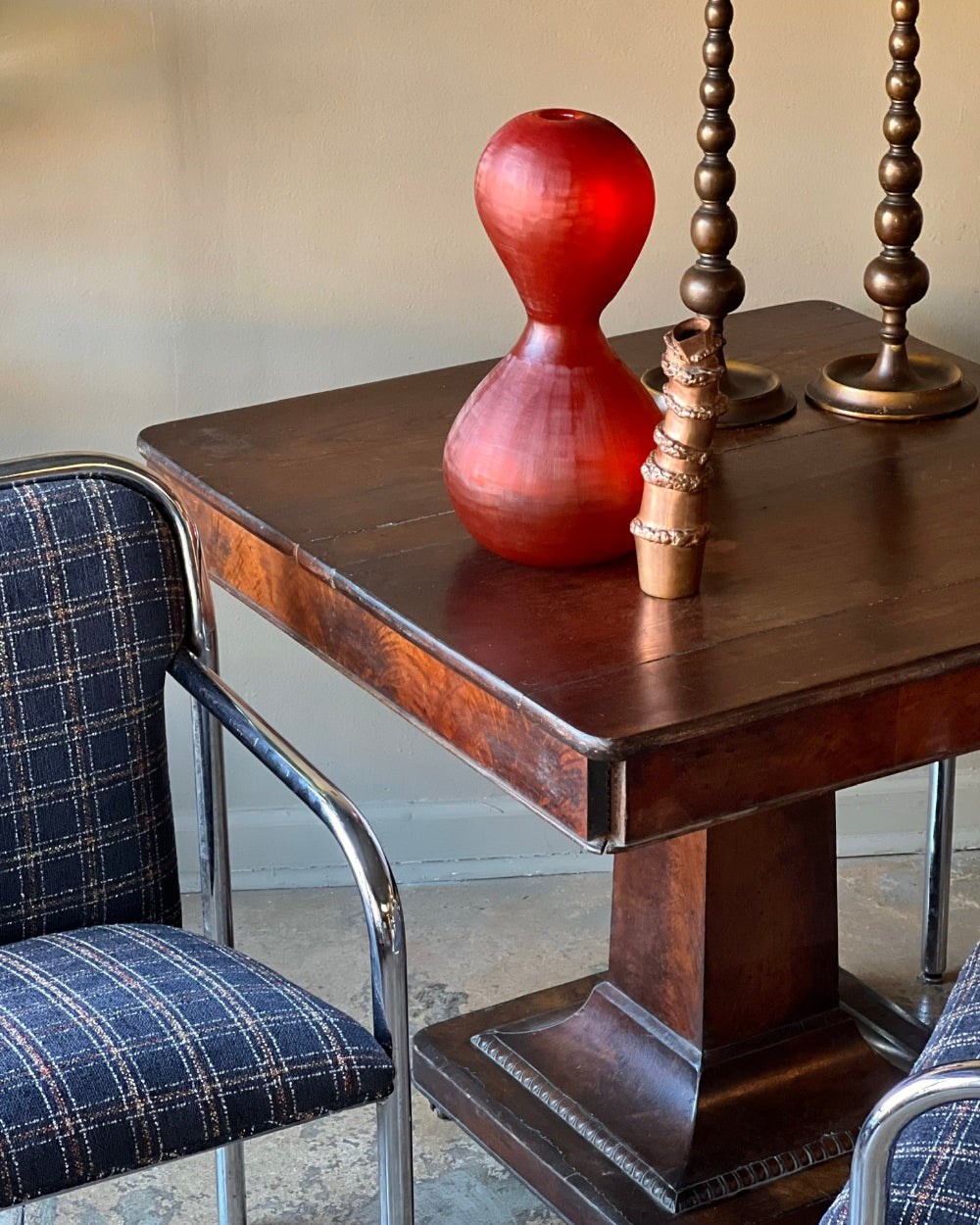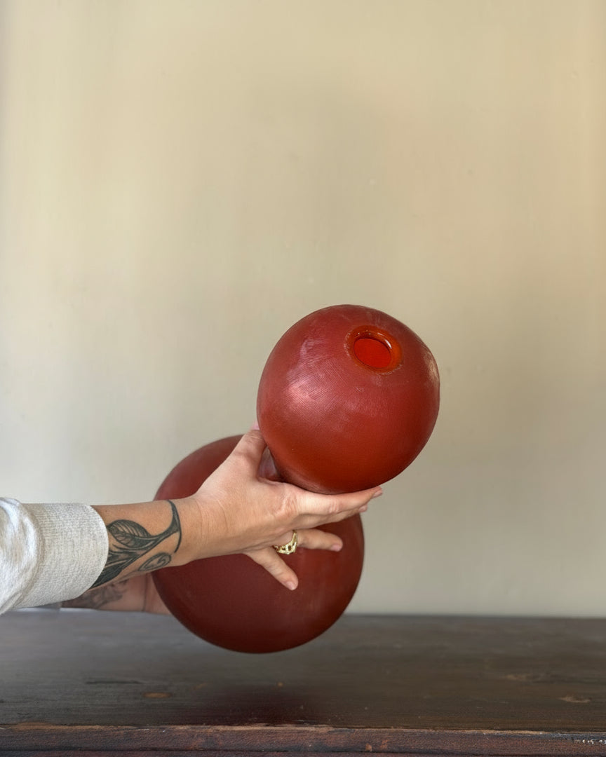 When the light hits this mouth blown vessel, it ignites. The color is stunning. A beautiful way to add a touch of color to a bookshelf or dining table. Age and artist unknown.