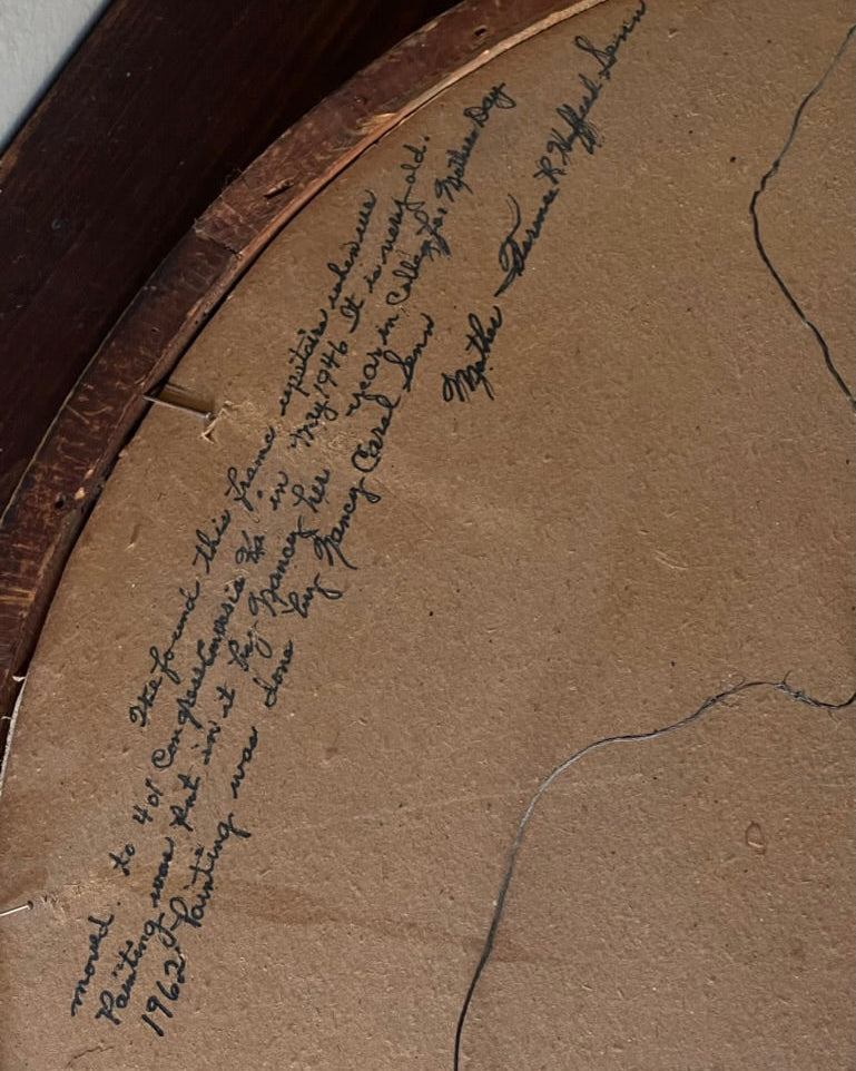 Original watercolor still life framed under glass. Lots of rich detail in each of the depicted fruits...especially love the orange in the center. The ornate 1940's frame has been repurposed to house this work of art from the late 60's. Information has been written on the back.