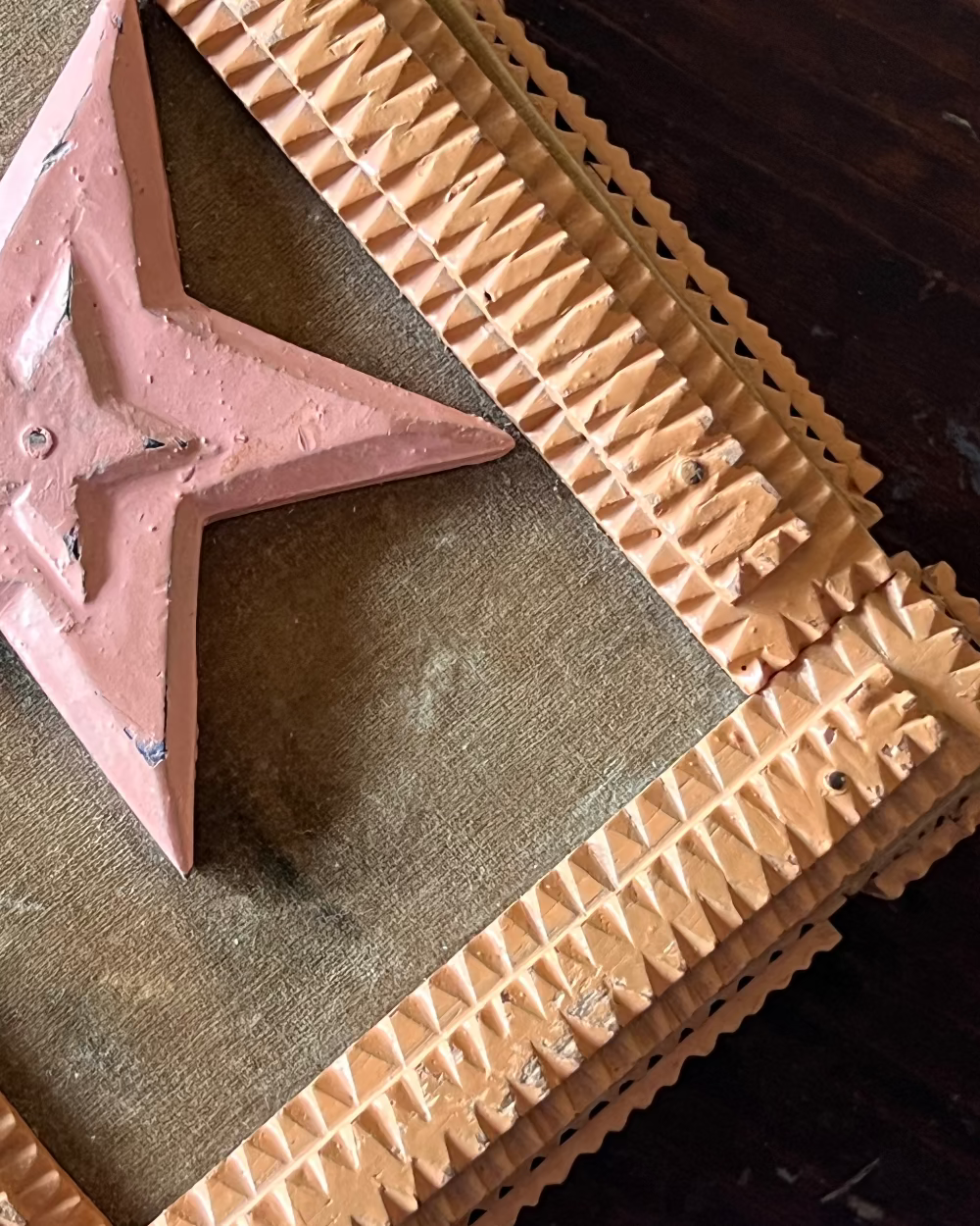 Star studded polychrome chip carved folk art box with faded olive green velvet. The peach and pink colors are lovely and rich. Structure has been handmade. Artist unknown. c. 1950s.