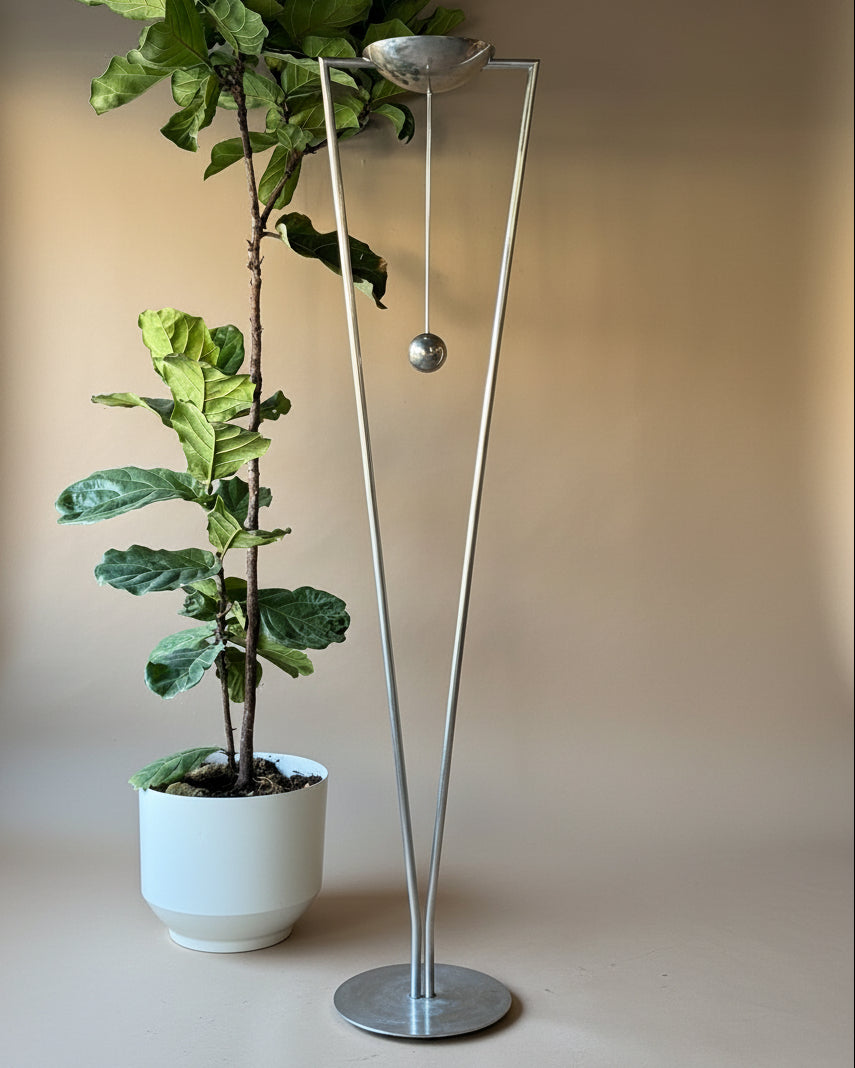 In the style of Ron Rezek. Stainless steel postmodern multi-directional floor lamp with adjustable head. The on/off dimmer switch is the counterbalance extension with ball. c. 1980s. Fantastic condition. Does use halogen bulbs.