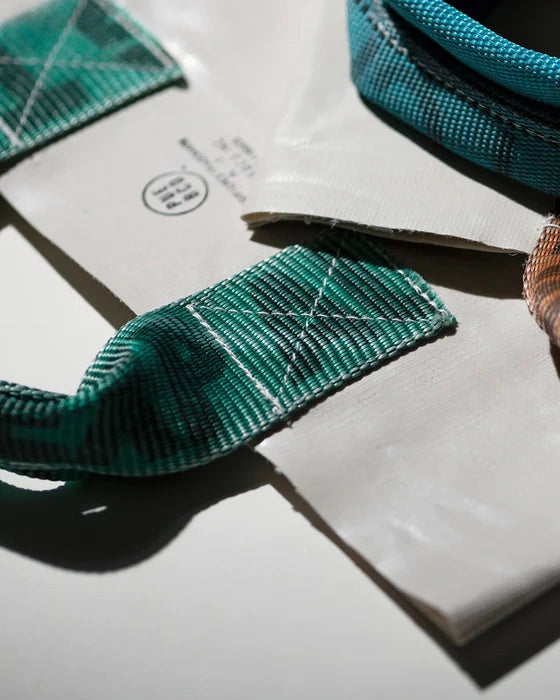 Handmade from recycled canvas material, each tote carries the marks of its past, offering a truly unique, one-of-a-kind aesthetic. To enhance durability and longevity, the canvas is carefully laminated, creating a protective layer that reinforces the fabric while maintaining its raw, vintage charm. The handles are upcycled from cargo belt straps sourced in India that are then dyed and offered in blue, green and orange.