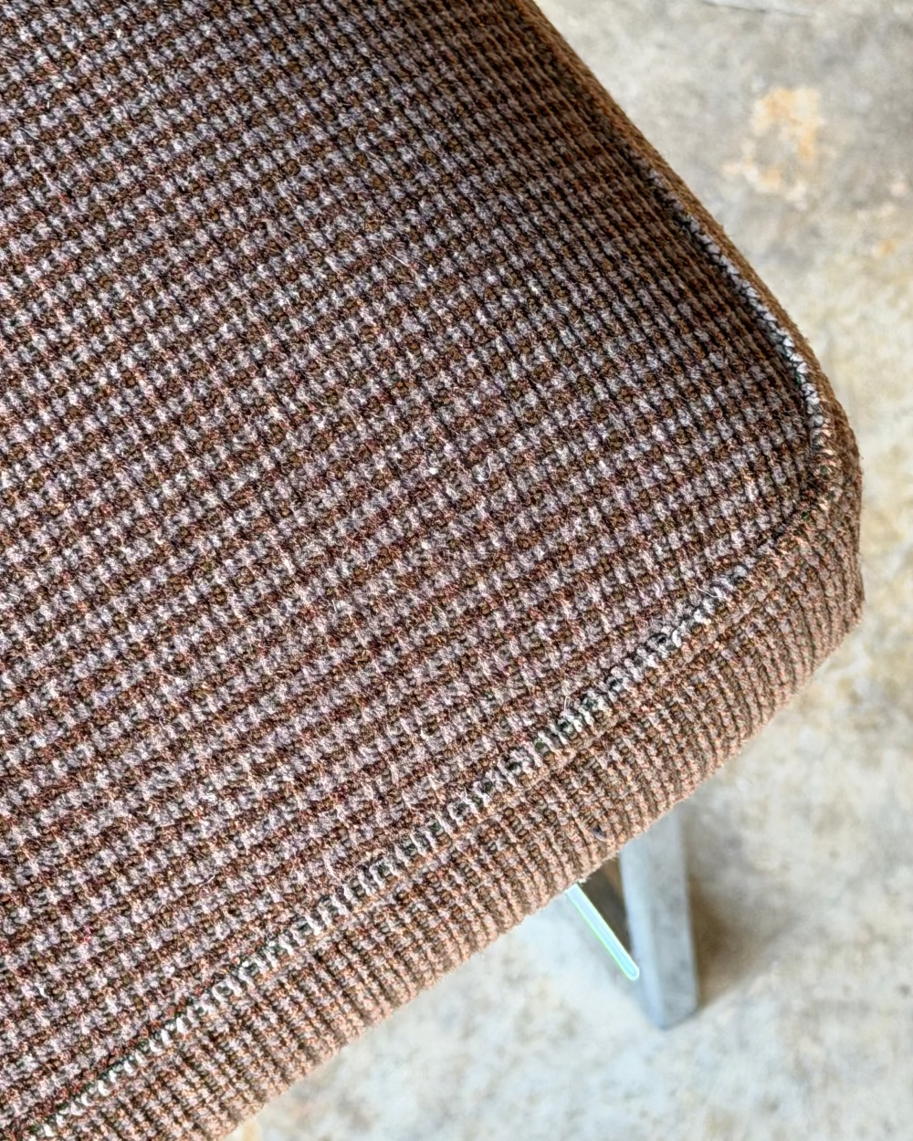 Lovely vintage dining chairs in the style of iconic Postmodern designer Milo Baughman. Simple chrome framework with newly upholstered bodies. Fabric is a small textural velvet check in lavender and cocoa. Overall excellent condition. Sold as a set of 4.