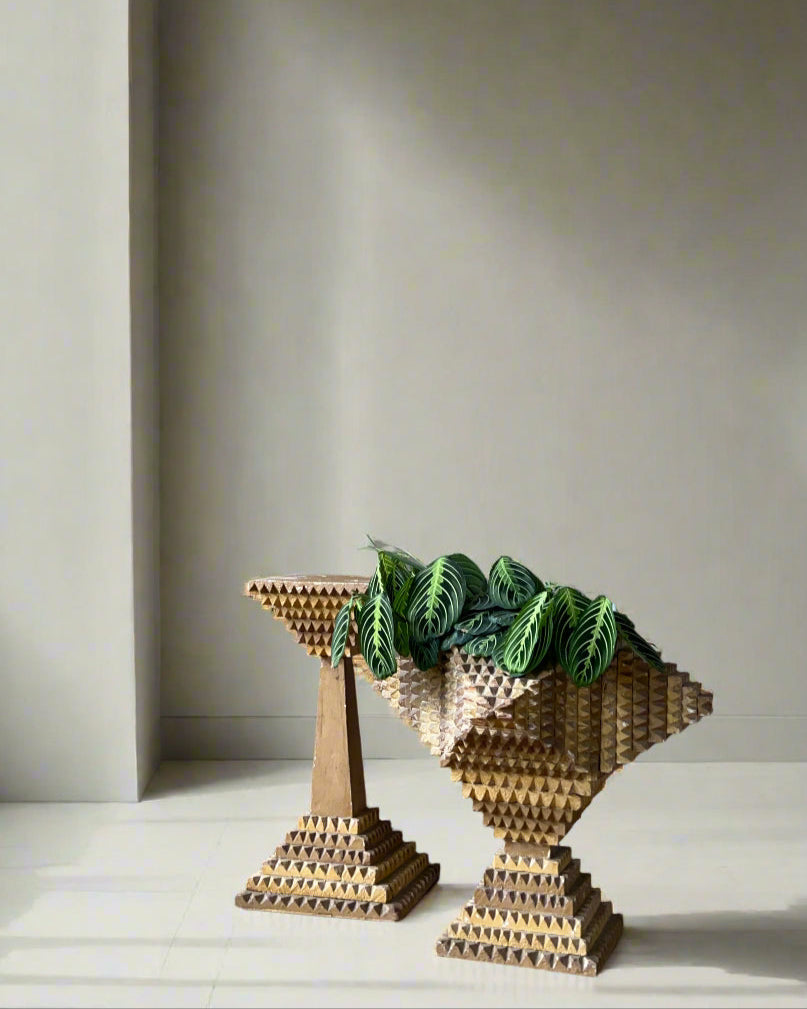 A fantastic introduction into Tramp Art! Functional and striking. Two piece stacking plant stand hand carved and painted. c. 1940's. The top portion has been lined in red felt, but could easily be removed. Great condition. Sturdy and multi-functional. You could even use the pieces separately if you are feeling saucy. Plant not included.