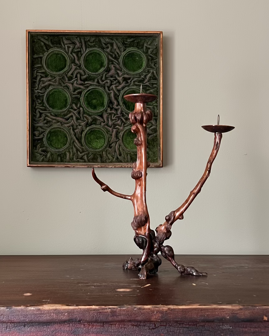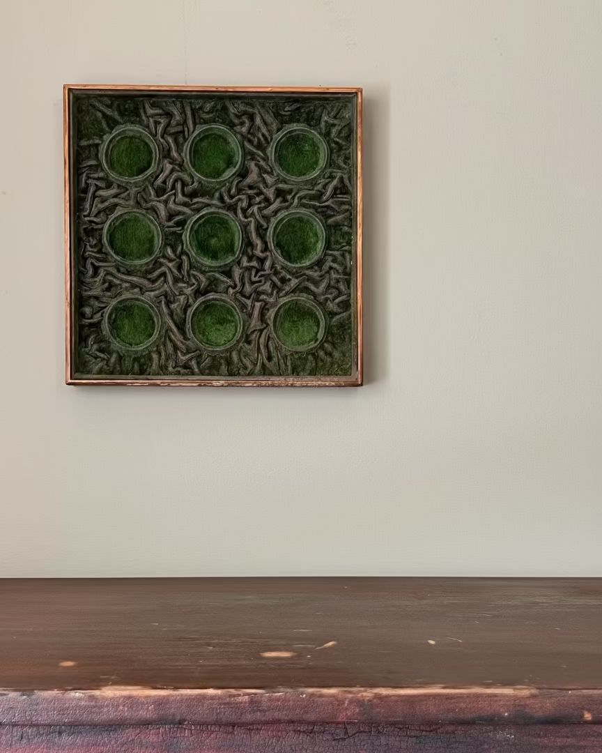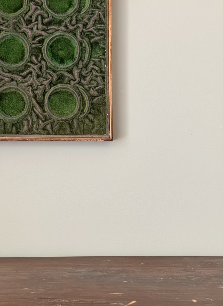 One of my favorite finds. Antique velvet lined display tray for pocket watches. Love the way the emerald green velvet has worn over time to create a beautiful work of art. Hangs perfectly on the wall.