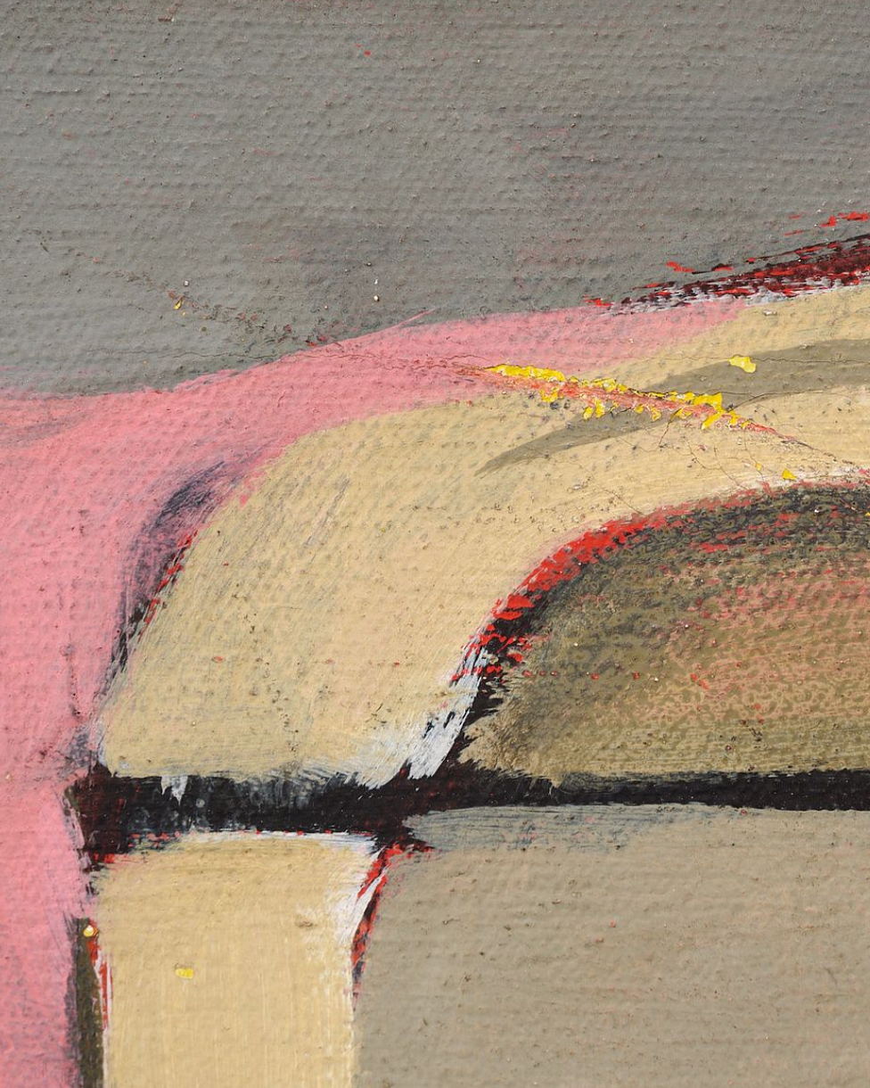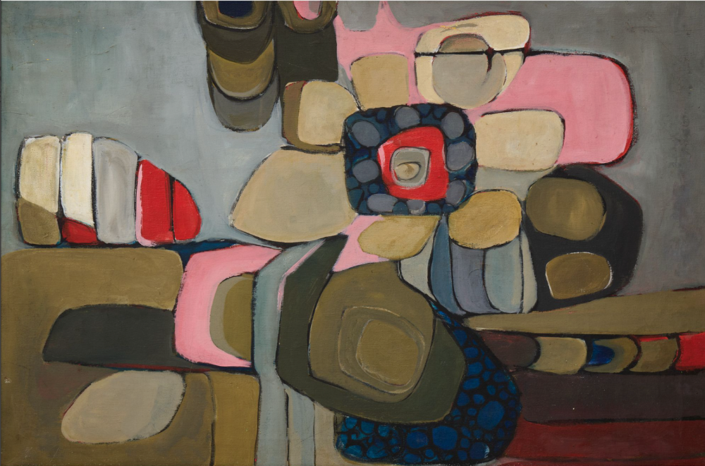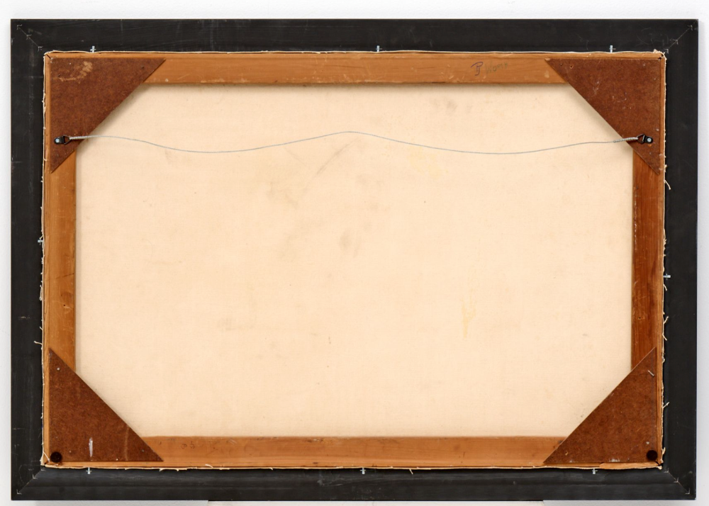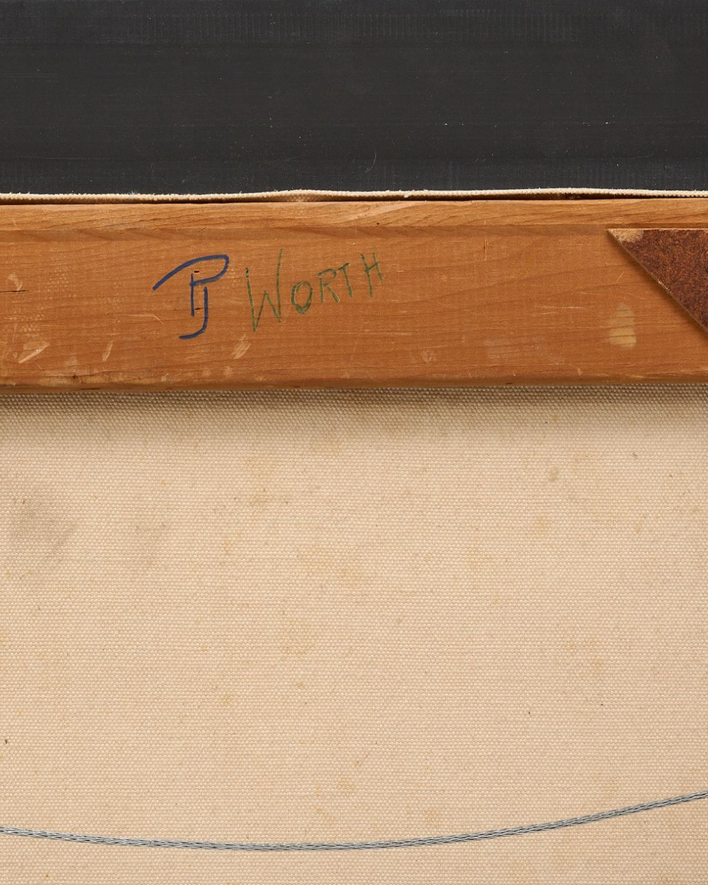 A vintage abstract oil on canvas executed in a color palette of green, pink, and blue. Possible artist signature "PJ Worth" written in pencil to the stretcher. Stretched canvas framed in thick matte black.