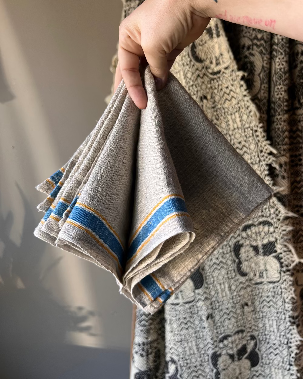 Sold as a pair. Lovely flax linen tea towels with classic blue and yellow stripe on each. Fantastic vintage condition. Machine wash gentle cycle. Tumble dry low.